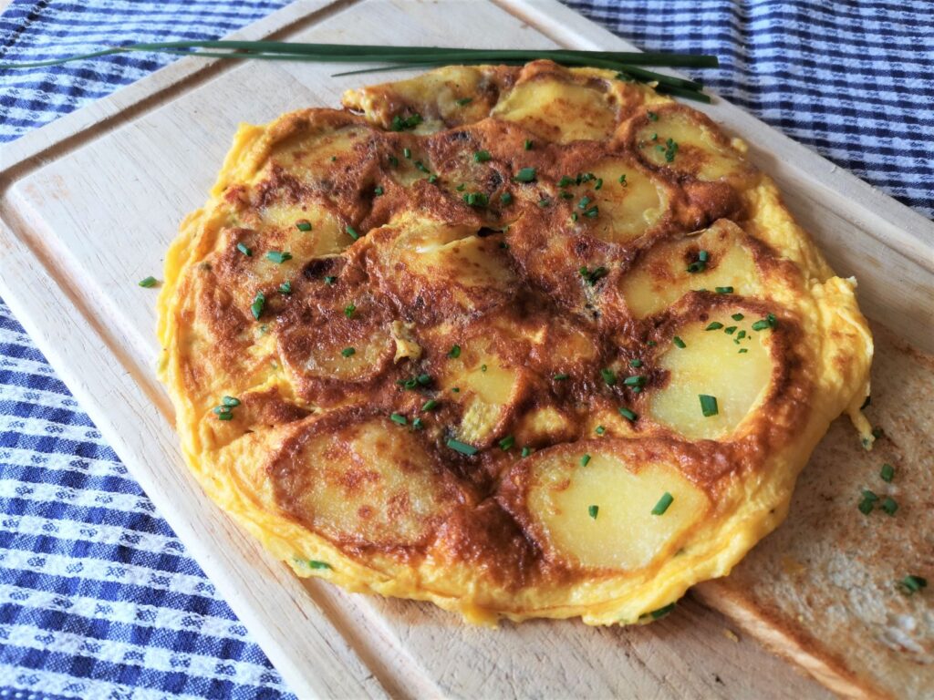 - Razžvrkljana jajca in sir polijemo čez krompir in pečemo ca 3 minute na malo več kot srednjem ognju (8 od 10)