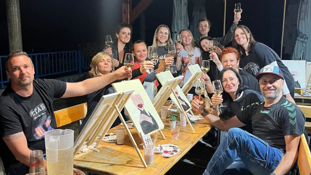 Izbranemu slikarskemu team buildingu (od 1 do 3 zgoraj) dodamo degustacijo 3 vrst vin s kratko predstavitvijo vinarja.